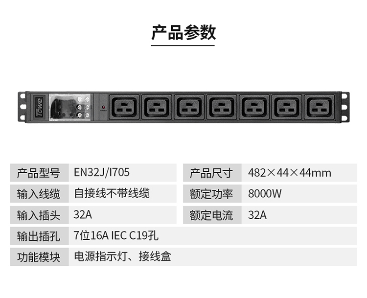 TOWE同为自接线PDU 7位16A IEC C19,带电源指示灯,EN32J/I705