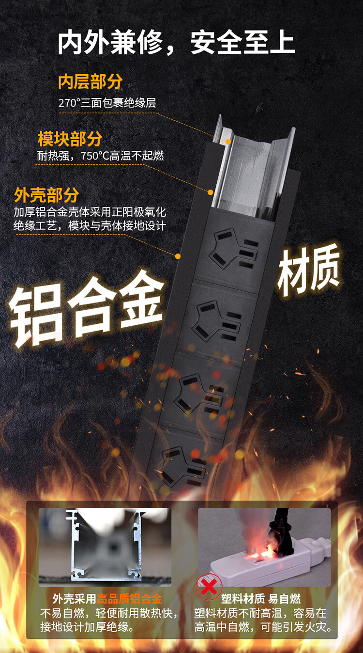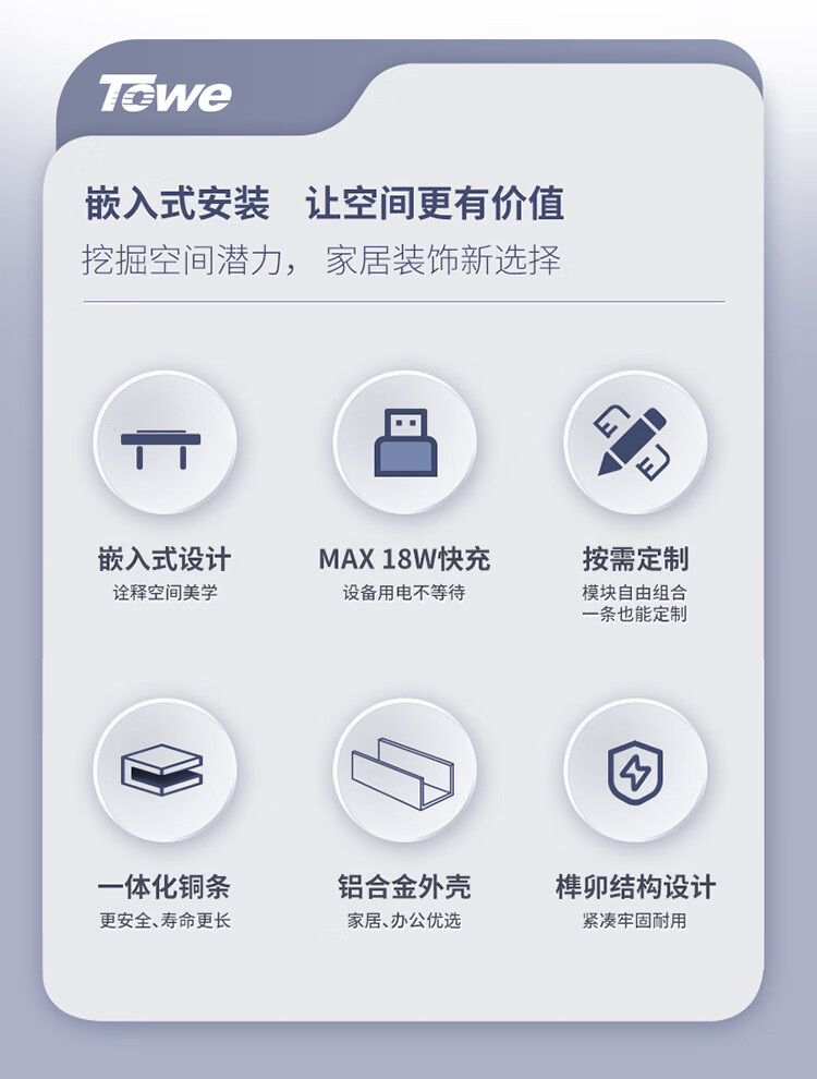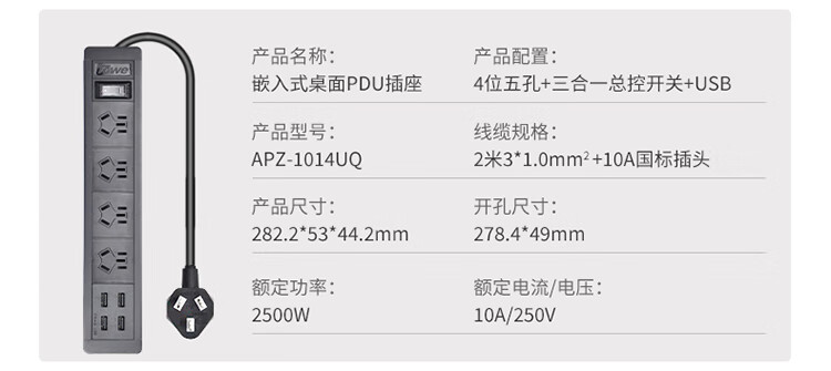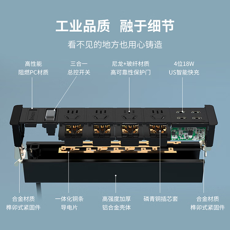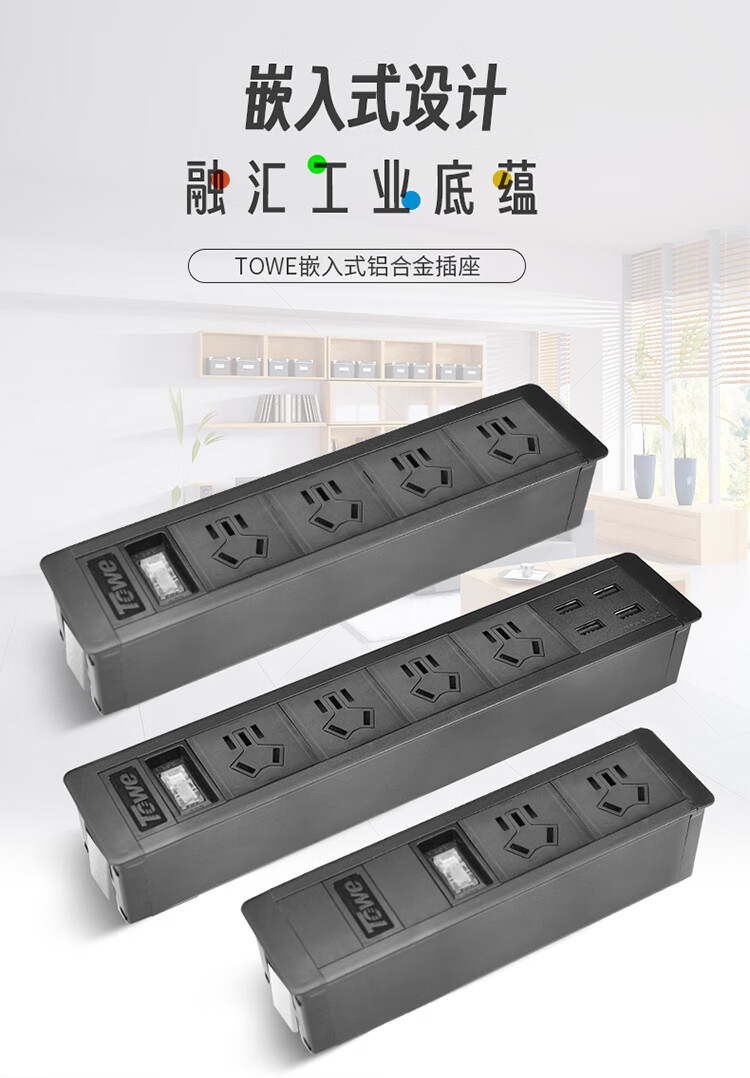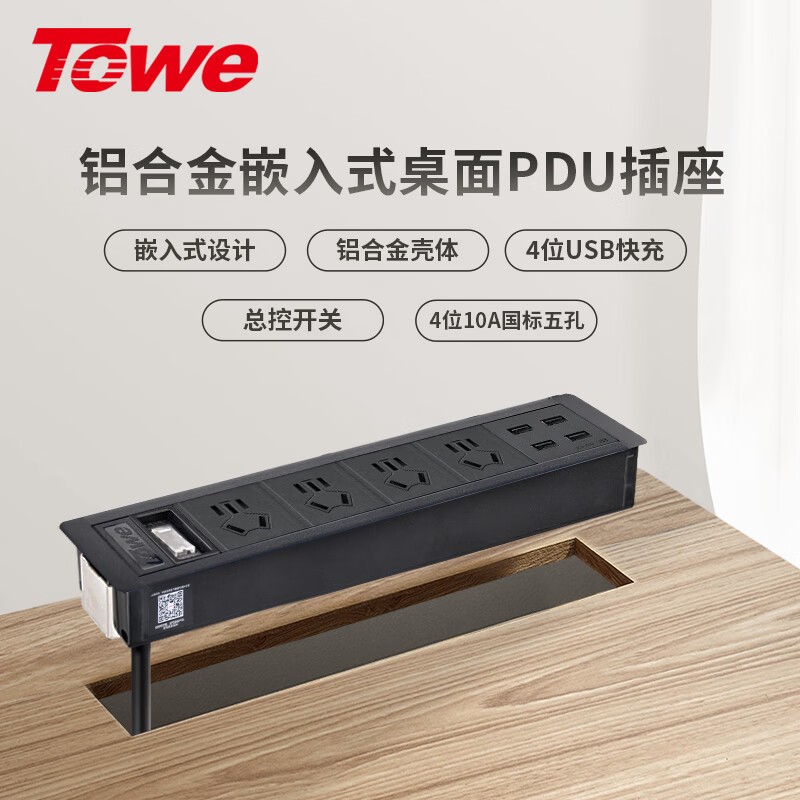 同为TOWE桌面嵌入式总控USB充电插线板/拖线板 多功能创意炫彩桌面隐蔽式PDU插排插座 新国标三位四位五位三合一总控开关 铝合金外壳插座 APZ-1013USQ/APZ-1014UQ