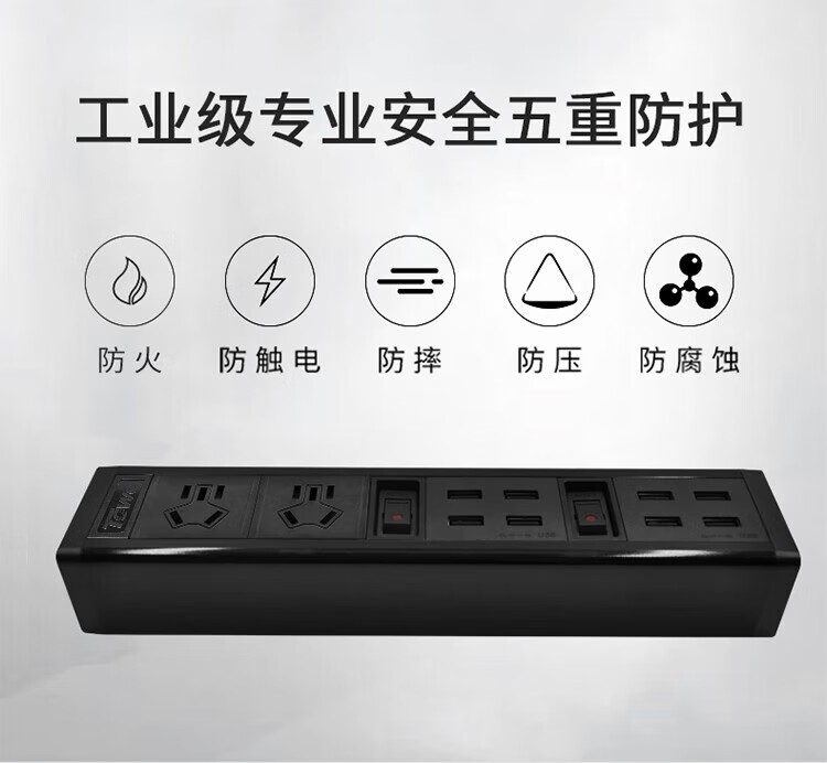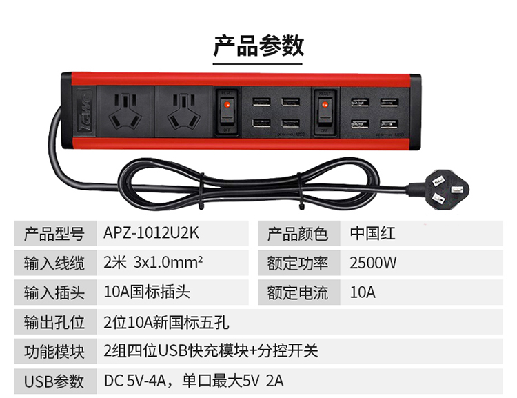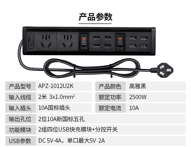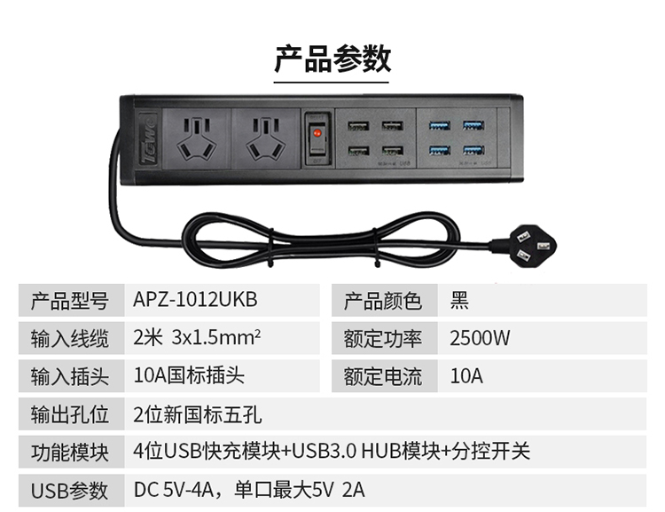 TOWE同为USB快充桌面PDU插座二合一防过充工业级智能快充接线板2路电源8口USB快充摔不烂高强度铝合金阳极氧化外壳插座 APZ-1012U2K/APZ-1012UKB
