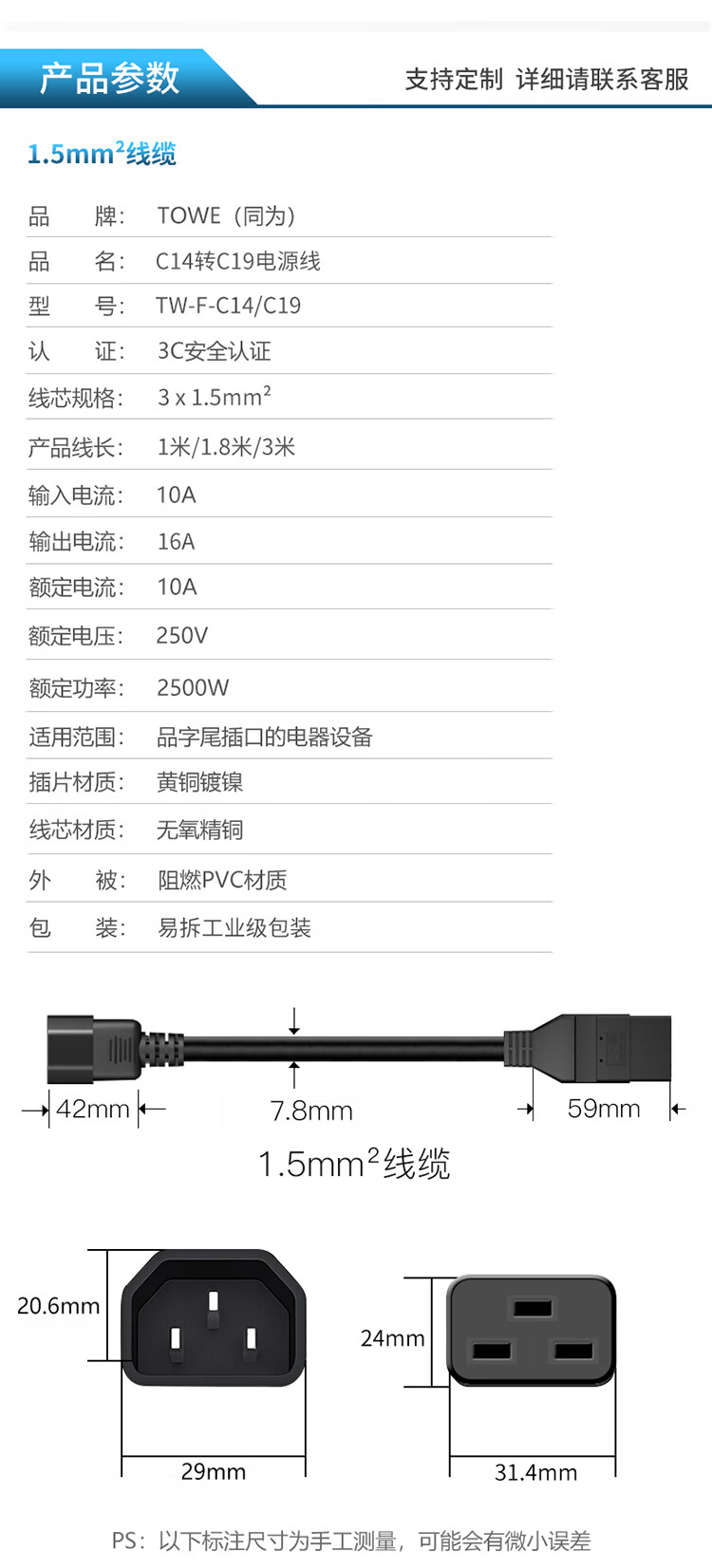 TOWE同为IEC C14转C19线1.5平电源转换线IDC机房数据中心不间断电源UPS服务器PDU电源线TW-F-C14/C19