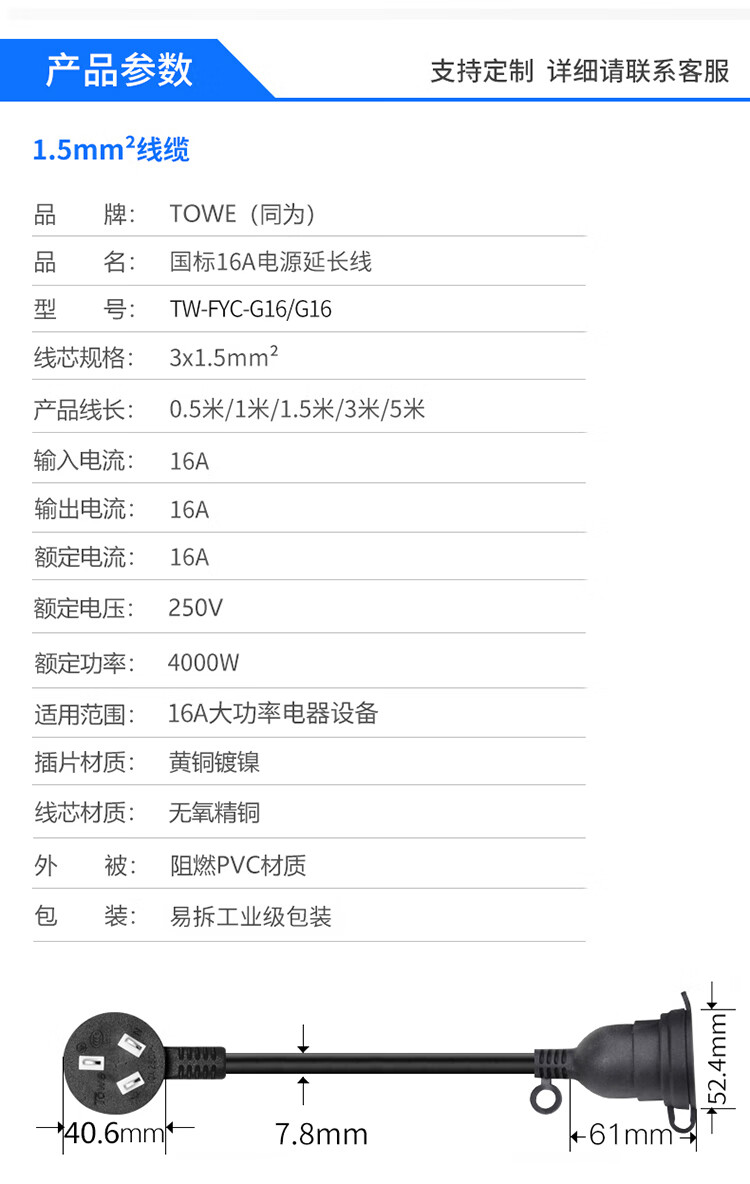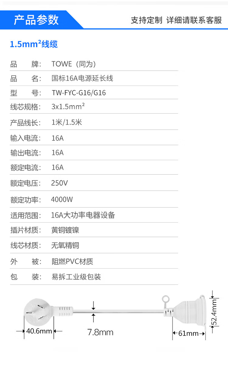 TOWE同为国标16A延长线插座1.5平线电动车电瓶车电动汽车16a大功率 空调热水器 防水延长线插座 TW-FYC-G16/G16