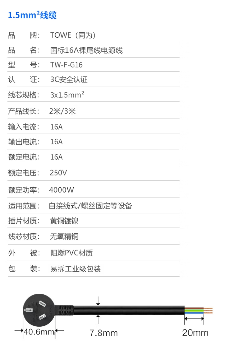 TOWE同为国标10A插头带线1.0平三项插头三相插头带线插头接线自接线电源线TW-F-10G10