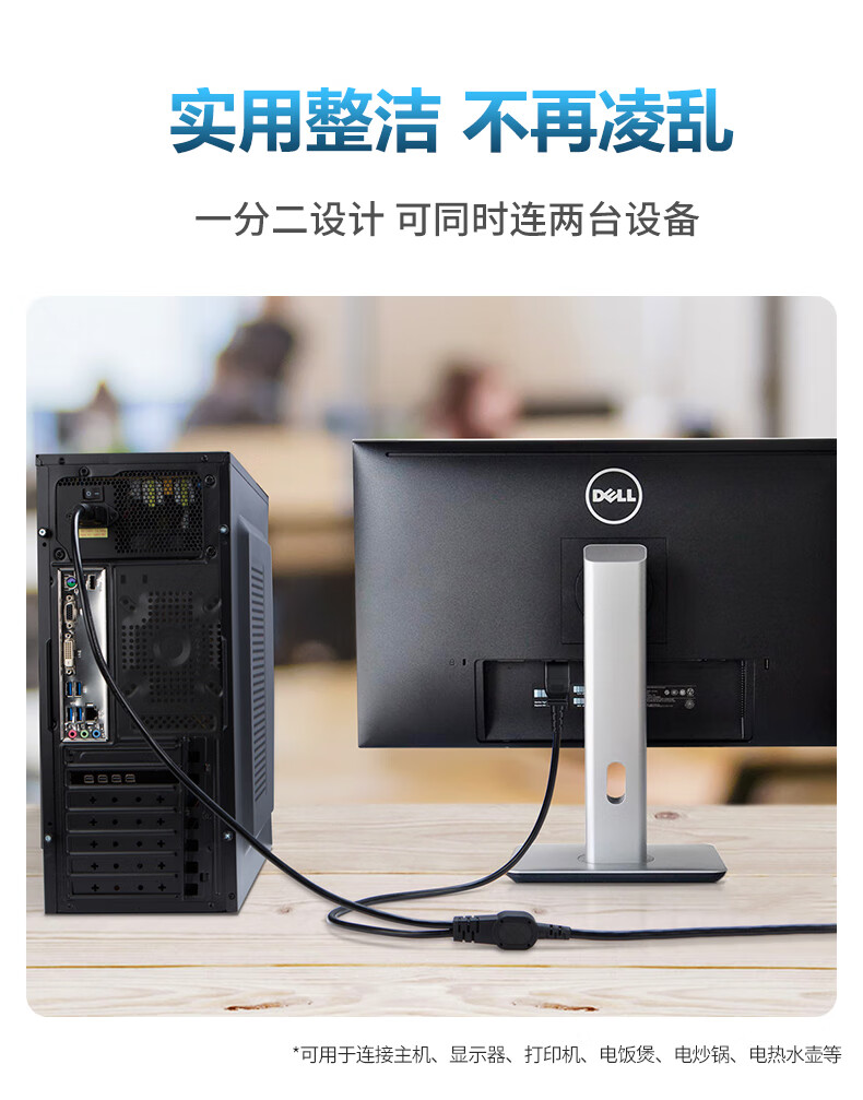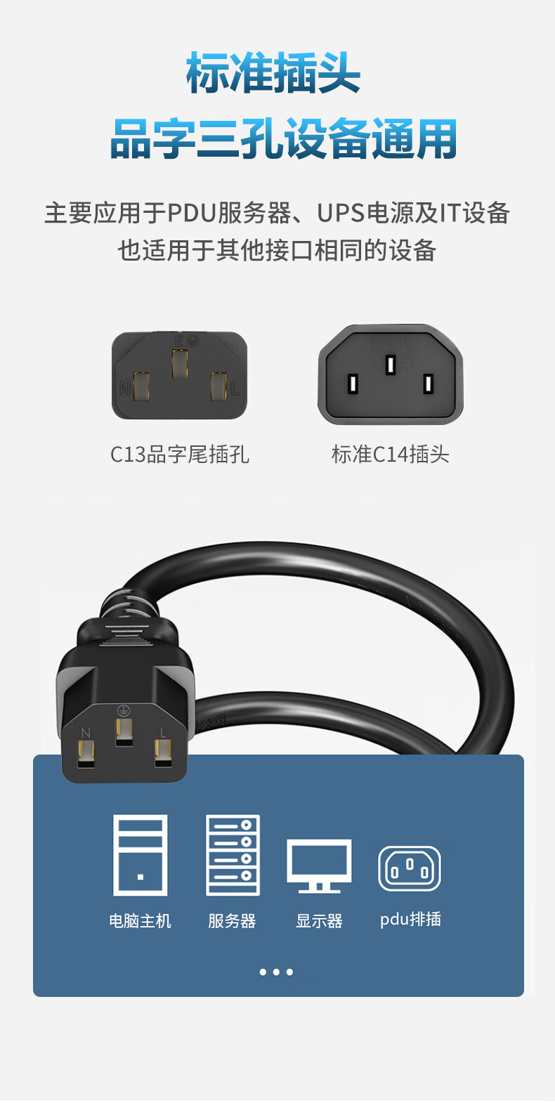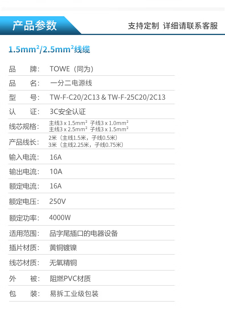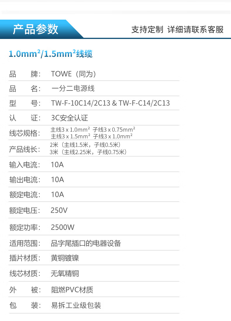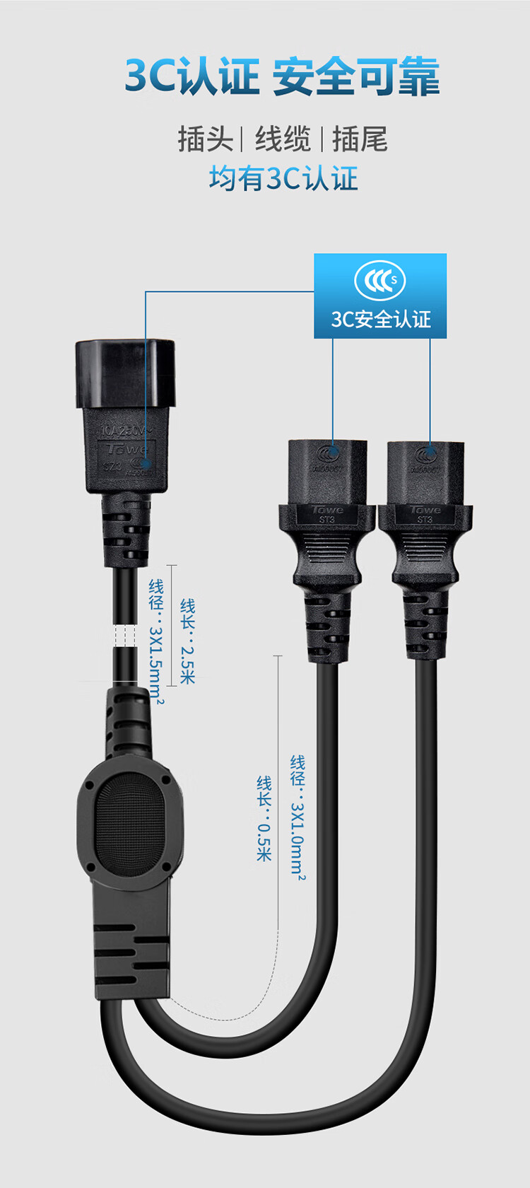 TOWE同为国标10A转2C13国标品字尾一分二电源线10A转2C13 电脑 服务器电源线TW-F-G10/2C13