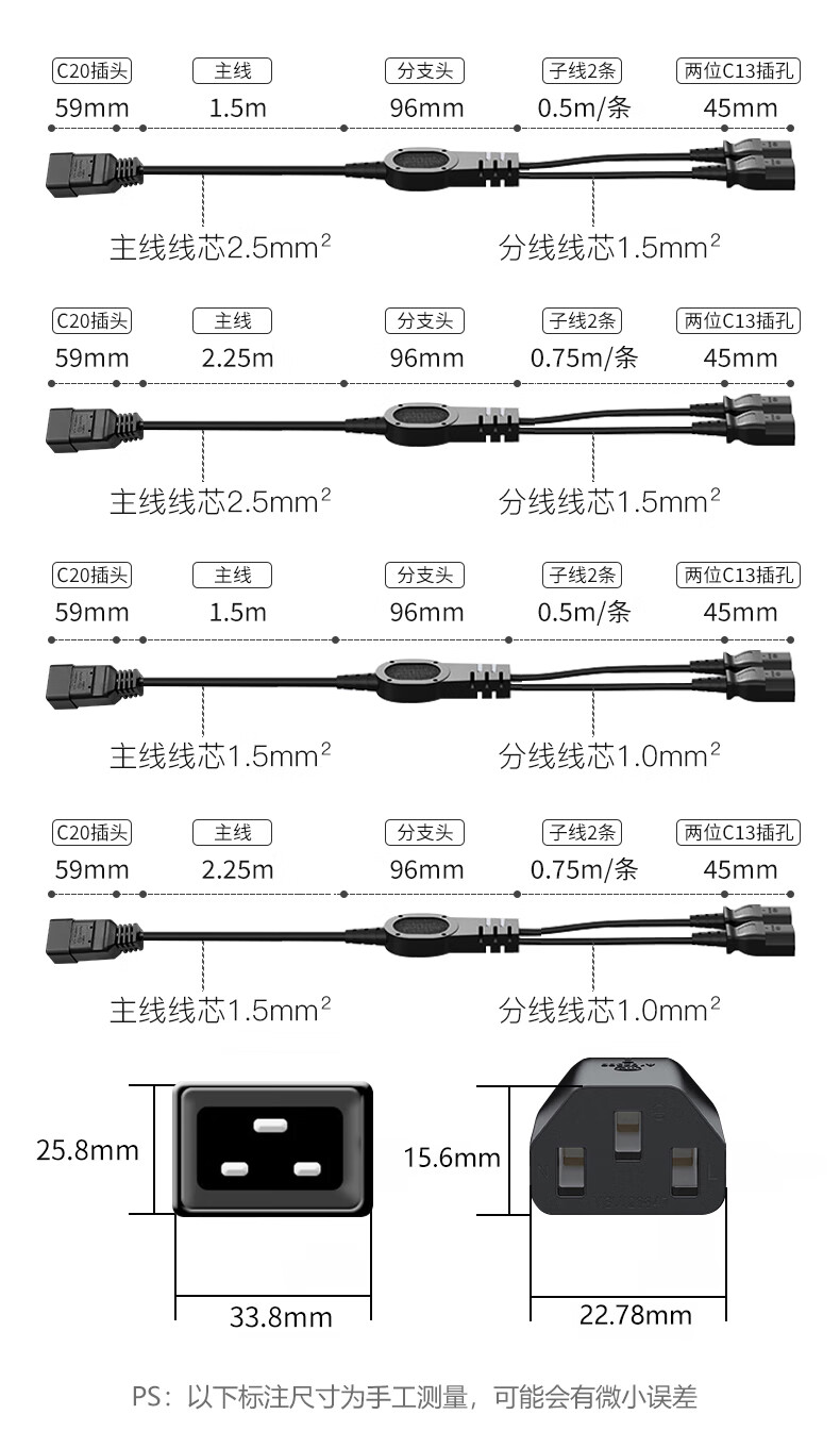 TOWE同为国标IEC C20转2C13 电脑 服务器 电脑 交换机 IDC机房数据中心PDU电源线 TW-F-C20/2C13