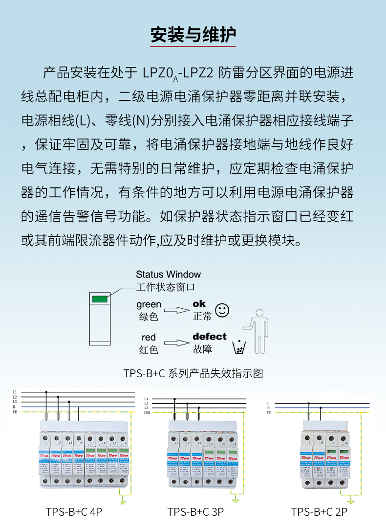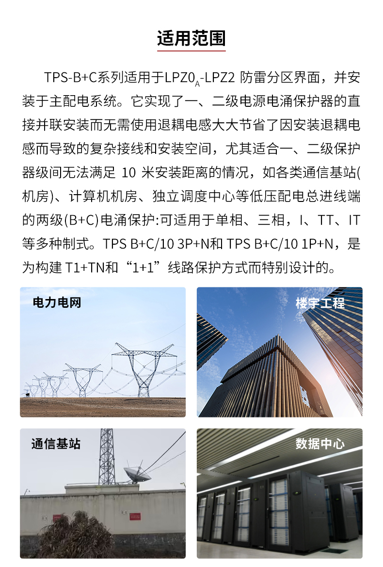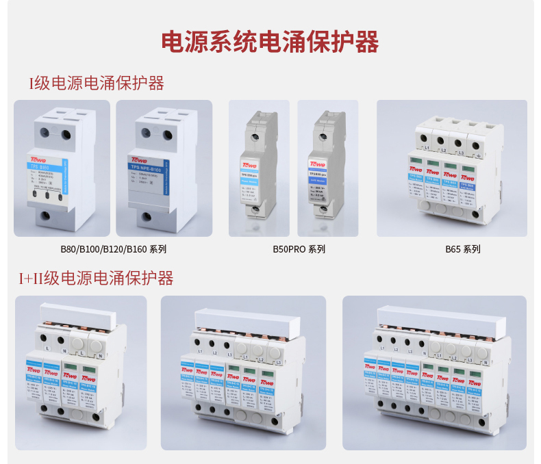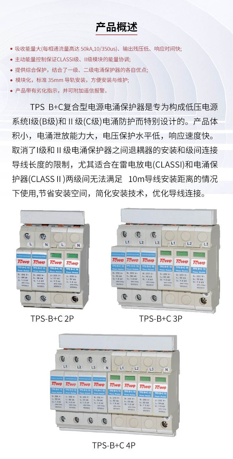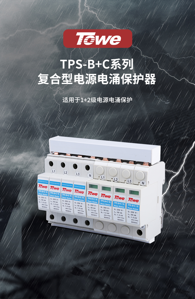 TOWE同为B+C级复合型电源电涌保护器保护低压电气装置免受直接雷击和电涌灾害安装在220/380V单相三相低压供电系统的电网进线处或总配电盘中 TPS B+C 4P/3P+N/3P/2P