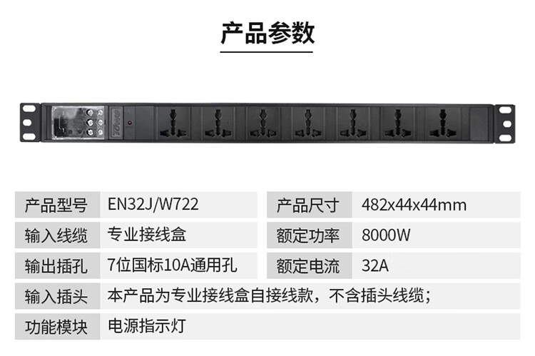 TOWE同为自接线PDU电源机柜插座插排大功率接线盒国标插孔电源分配器横装8位自接线国标PDU专业接线盒7位国标10A通用孔,EN32J/W722