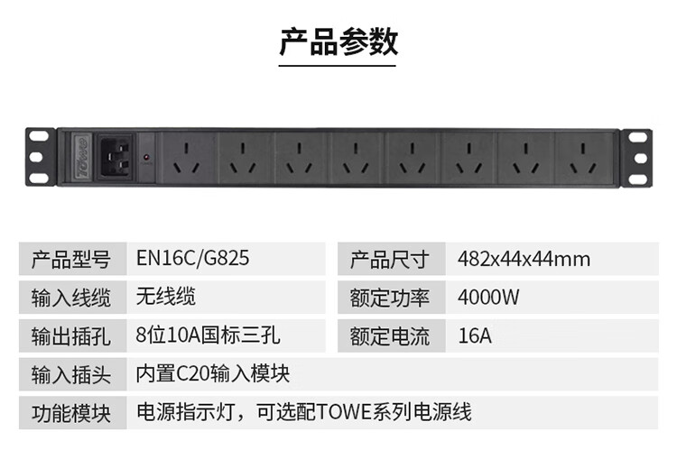 TOWE同为C20输入16A自接线不带线工程安全PDU电源机柜插座 输出国标10A插孔C20输入国标PDU内置C20输入模块8位10A通用,EN16C/W802
