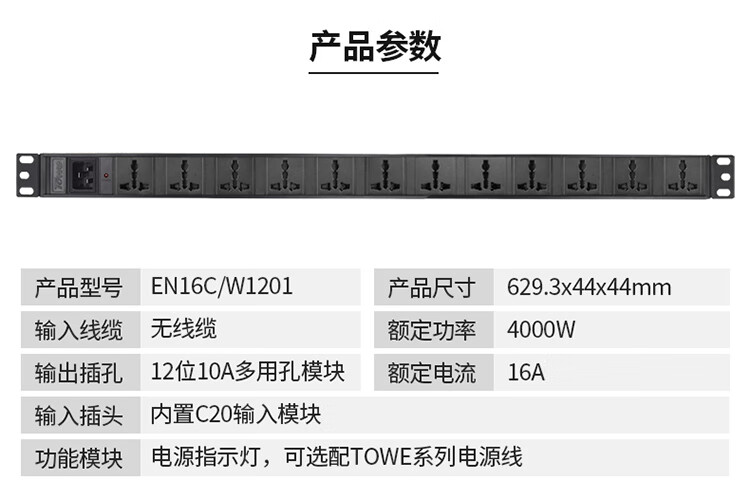 TOWE同为C20输入16A自接线不带线PDU输出国标10A插孔C20输入国标PDU内置C20输入模块12位10A多用孔模块+指示灯,EN16C/W1201