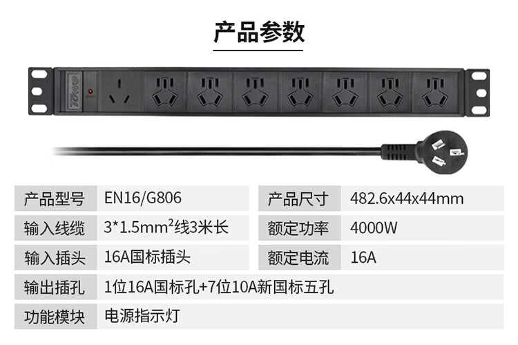 TOWE同为7位8位16A pdu电源机柜插座16A国标三孔五孔PDU插座电源分配器国标16A基础款1位16A国标孔+7位10A新国标五孔 EN16/G806