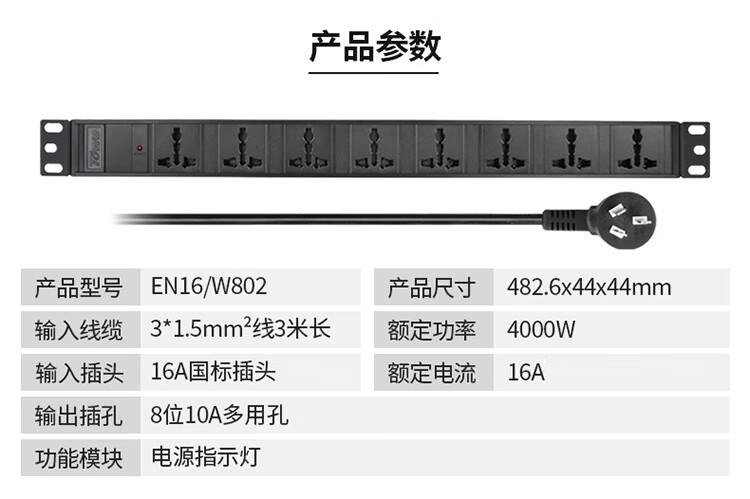 TOWE同为8位pdu基础款 工程安全机柜插排16a PDU电源分配器 国标总控16A IDC机房数据中心PDU排插 8位10A多用孔,EN16/W802K