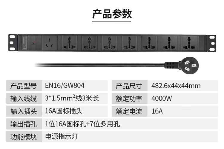 TOWE同为7位8位16A pdu电源机柜插座16A国标三孔五孔PDU插座电源分配器国标16A基础款1位16A国标孔+7位多用孔,EN16/GW804