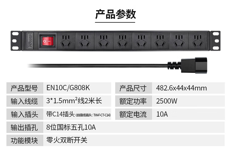 TOWE同为8位pdu电源机柜插座基础款10a PDU电源分配器国标10A IDC机房数据中心PDU排插国标总控10A 8位10A新国标五孔,EN10/G800K