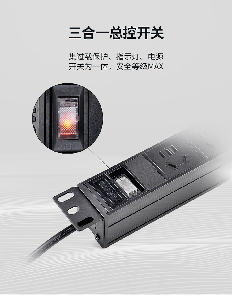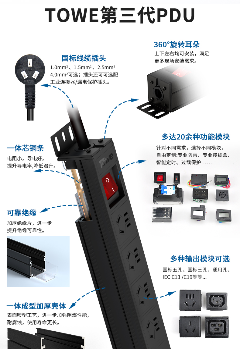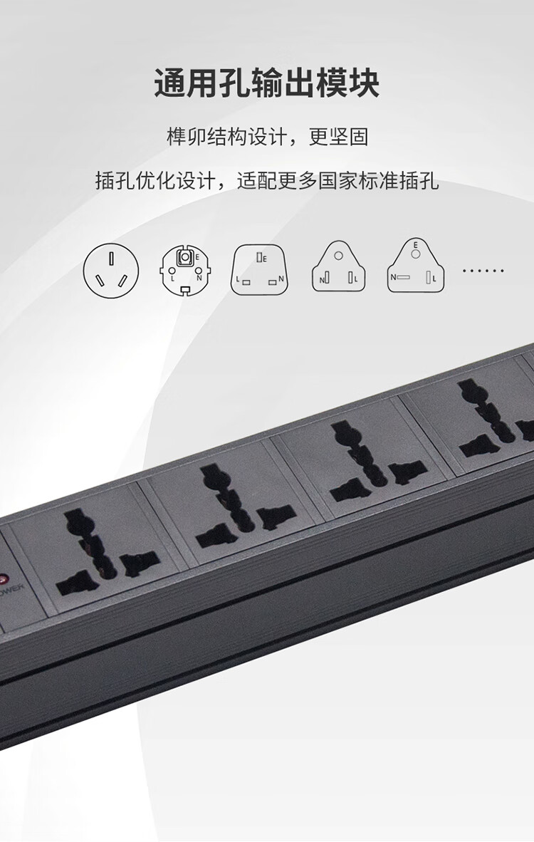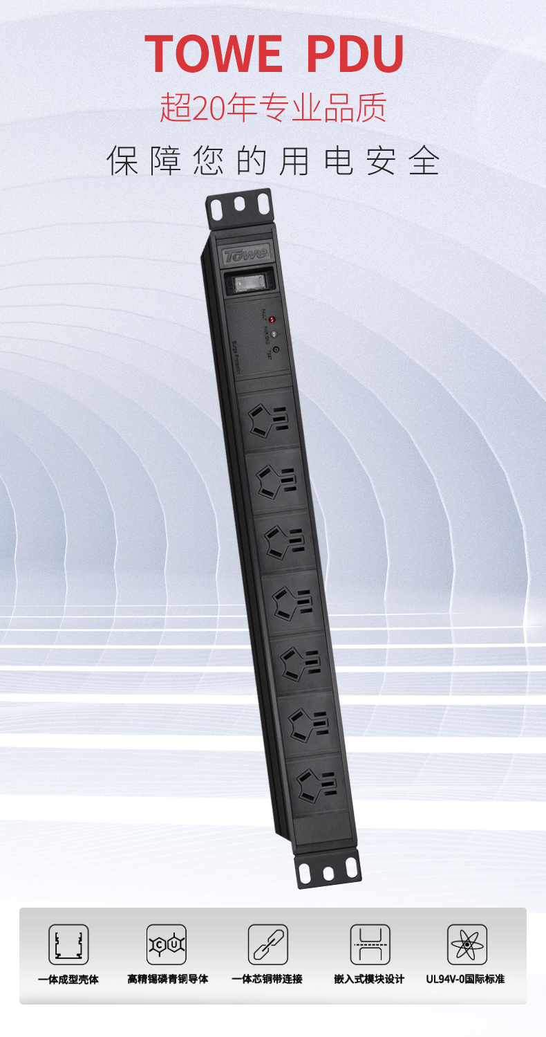TOWE同为国标16A工业三级防雷PDU安全机柜插座SPD 国标16A专业防雷 1位16A国标孔+7位10A新国标五孔+防雷防浪涌,EN16/G820S