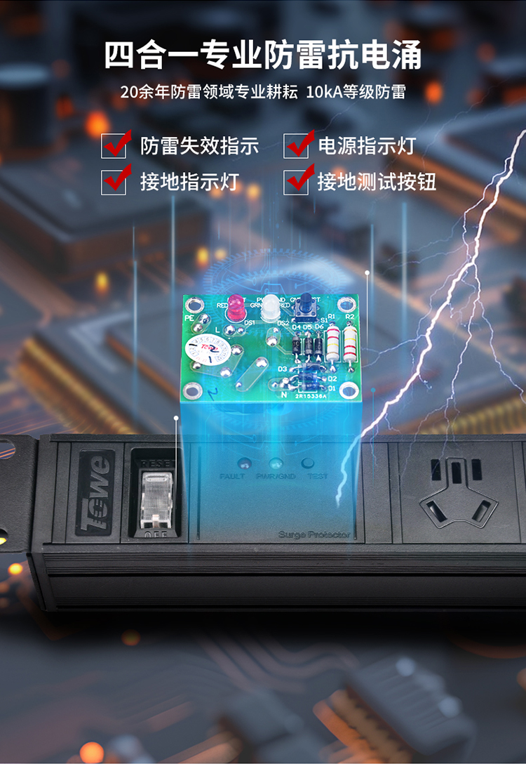 TOWE同为工业三级防雷PDU安全机柜插座SPD防浪涌防电涌防雷击 国标10A专业防雷 7位10A新国标五孔+四合一防雷防浪涌,EN10/G708KS