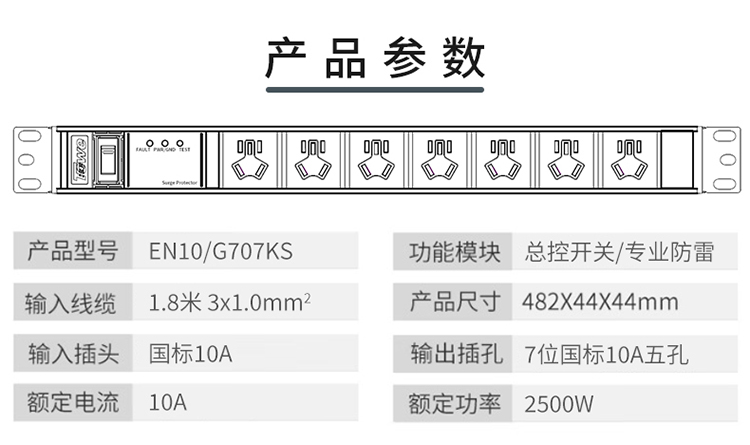 TOWE同为工业三级防雷PDU安全机柜插座SPD防浪涌防电涌防雷击10A机房插座插排插线板 国标10A专业防雷 7位10A国标五孔,EN10/G707KS