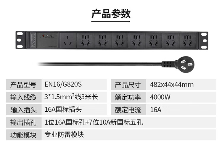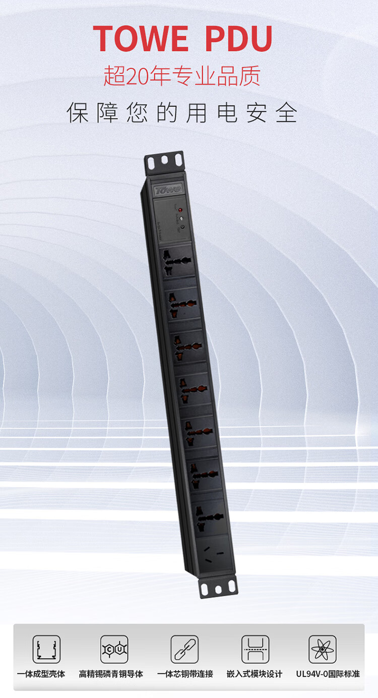 TOWE同为国标16A工业三级防雷PDU安全机柜插座SPD 国标16A专业防雷 1位16A国标孔+7位10A新国标五孔+防雷防浪涌,EN16/G820S