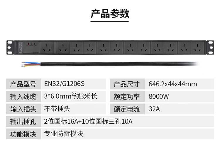 TOWE同为国标竖装工业三级防雷大功率PDU安全机柜插座 SPD防浪涌防电涌 国标竖装专业防雷 2位国标16A+10位国标三孔10A,EN32/G1206S