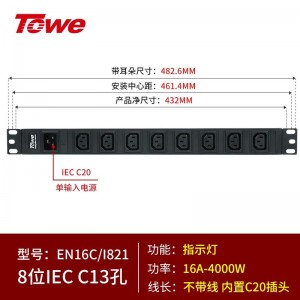 TOWE同为C20输入16A自接线不带线工程安全PDU电源机柜 输出IEC C13美标欧标插孔 C20输入IEC美标PDU 9位10A美标插座,EN16C/M908