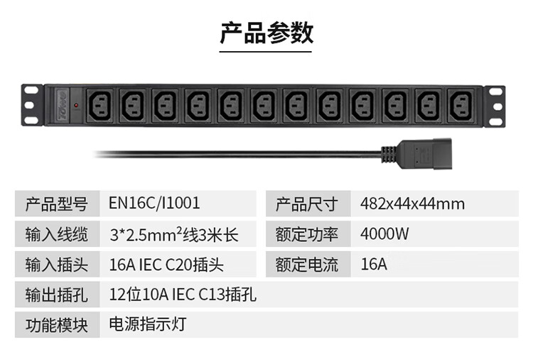 TOWE同为IEC C13 C19工业电源防雷PDU电源机柜插座 国际通用IEC 大功率机柜PDU IEC插孔横装大功率款 12位10A IEC C13插孔,EN16C/I1001