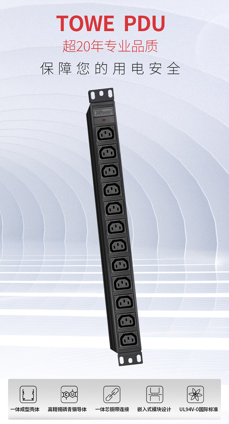 TOWE同为IEC C13 C19工业电源防雷PDU电源机柜插座 国际通用IEC 大功率机柜PDU IEC插孔横装大功率款 12位10A IEC C13插孔,EN16/I1001