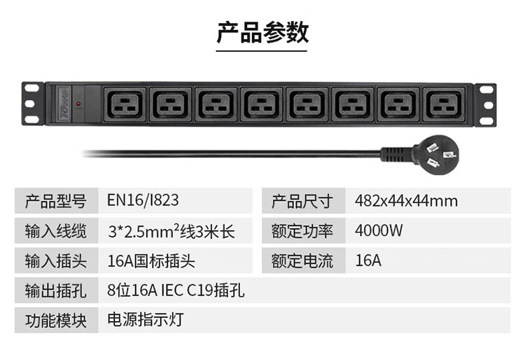 TOWE同为IEC过载保护自复位开关pdu电源安全机柜插座 防过流防过载安全排插 带指示灯 IEC横装过载保护 8位16A IEC C19插孔,EN16C/I823