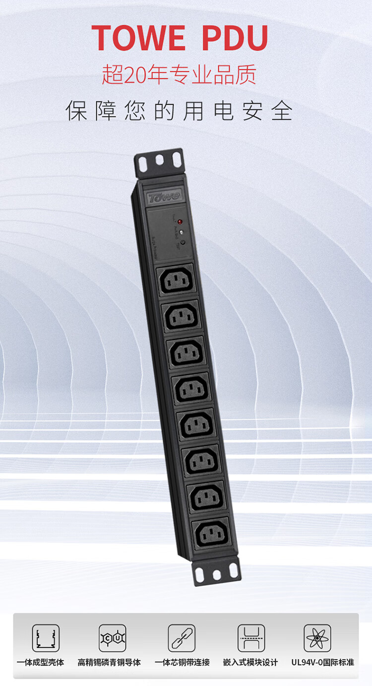 TOWE同为IEC C13 C19工业电源防雷PDU电源机柜插座 国际通用IEC 10a16a品字尾机柜PDU IEC插孔横装基础款 8位IEC C13 10A,EN10/I803