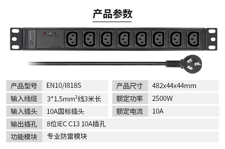 TOWE同为IEC过载保护自复位开关pdu电源安全机柜插座 防过流防过载安全排插 带指示灯 IEC横装过载保护 8位10A IEC C13,EN10/I812P