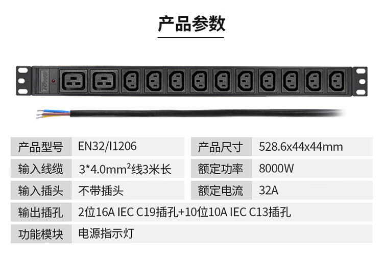 TOWE同为国际通用IEC 32/63A超大功率自接线PDU机柜插座 工程pdu 竖装IEC插孔加粗线缆 2位16A IEC C19+10位10A IEC C13,EN32/I1206