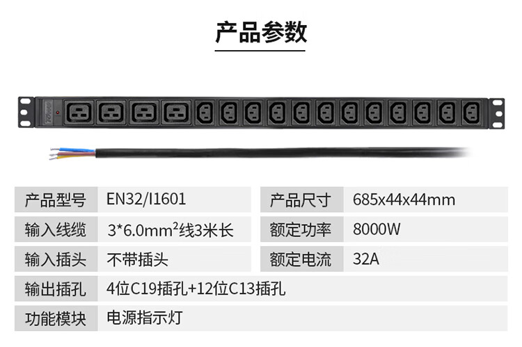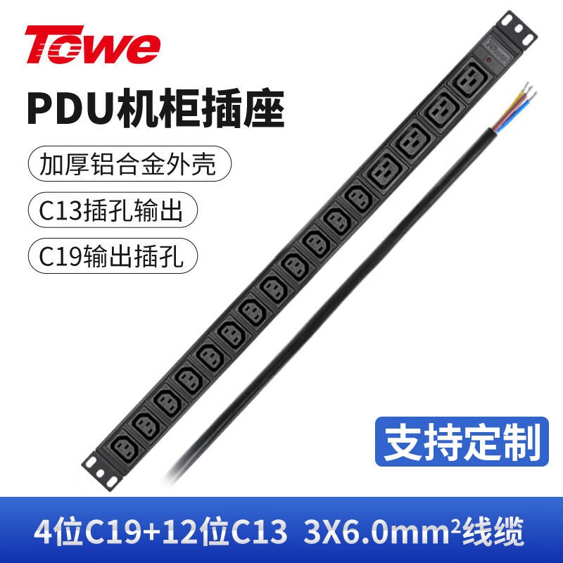 TOWE同为国际通用IEC 32/63A超大功率自接线PDU机柜插座 工程pdu 竖装IEC插孔加粗线缆 2位16A IEC C19+10位10A IEC C13,EN32/I1206