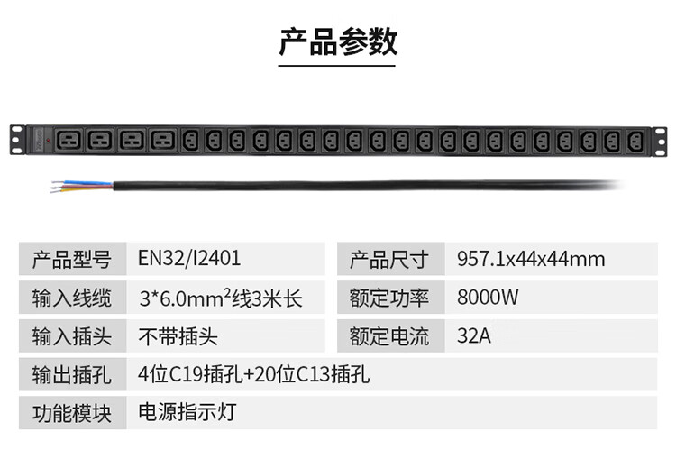 TOWE同为国际通用IEC 32/63A超大功率自接线PDU机柜插座 工程安全pdu插座插排 竖装IEC插孔加粗线缆 4位C19+20位C13,EN32/I2401