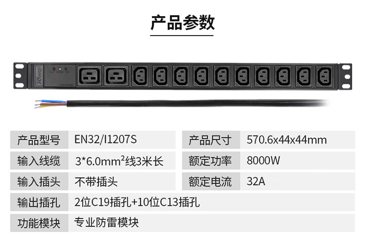 TOWE同为国际通用IEC C13C19竖装工业三级防雷大功率PDU安全机柜插座 SPD防浪涌 竖装IEC插孔专业防雷 2位C19+10位C13,EN32/I1207S