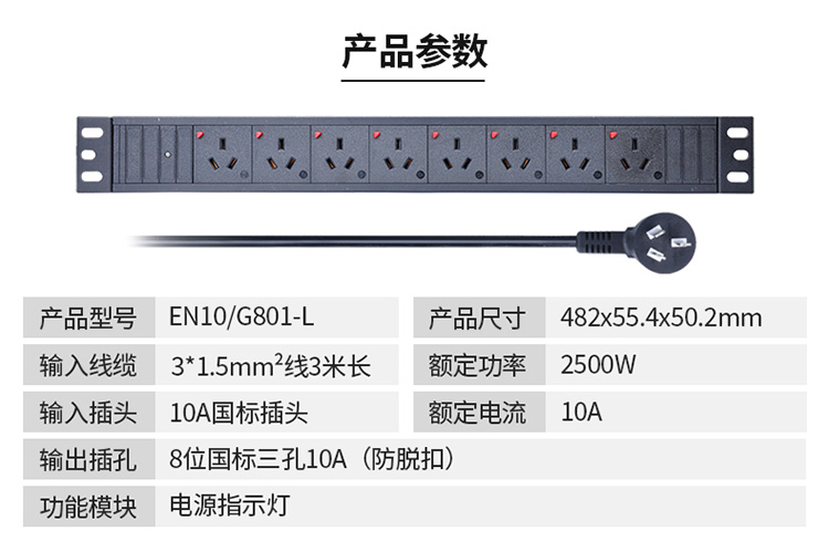 TOWE同为国标防脱扣工程安全机柜PDU插排 输出10A16A国标三孔高可靠性pdu电源机柜插座 防脱扣国标PDU 8位国标三孔10A,EN10/G801S-L