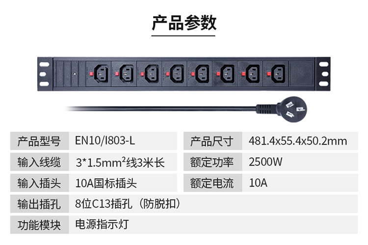 TOWE同为国标防脱扣工程安全机柜PDU插排 输出10A16A国标三孔高可靠性pdu电源机柜插座 防脱扣国标PDU 8位国标三孔10A,EN10/G801S-L