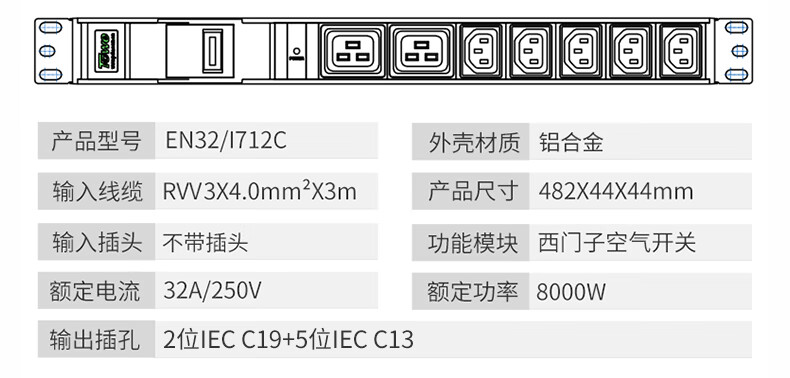 TOWE同为32A/63A超大功率自接线PDU机柜插座 带32A断路器 带断路器PDU工业插座 2位16A IEC C19+5位10A IEC C13 指示灯,EN32/I712C