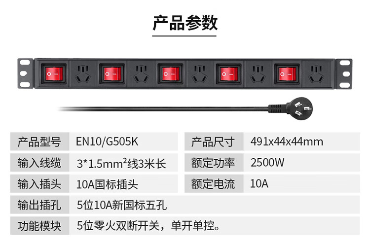 TOWE同为分控pdu机柜机架机箱插座 单开单控工业工程插排 水族鱼缸专用安全插座 分控工业PDU插座 5位10A新国标五孔,EN10/G502KS