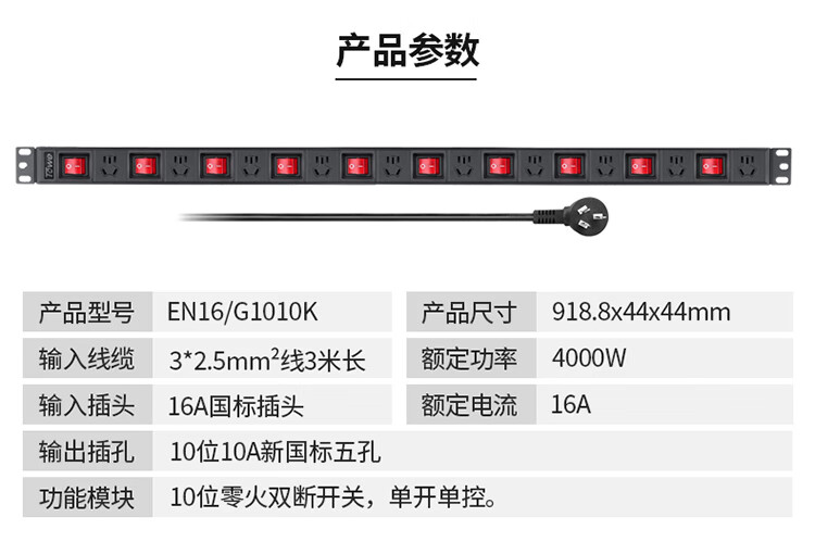 TOWE同为分控pdu机柜机架机箱插座 单开单控工业工程插排 水族鱼缸专用安全插座 分控工业PDU插座 10位10A新国标五孔,EN16/G1010K