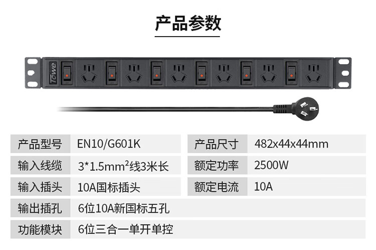 TOWE同为分控pdu机柜机架机箱插座 单开单控工业工程插排 水族鱼缸专用安全插座 分控工业PDU插座 6位10A新国标五孔,EN10/G601K