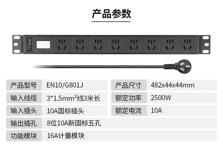 TOWE同为智能数显功率计量PDU机柜插座电源管理器 显示和计量电压插座排插 功率计量PDU插座 8位10A新国标五孔+16A计量模块,EN10/G801J