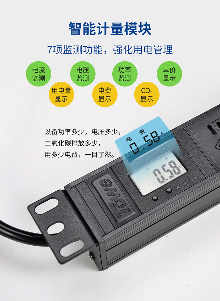 TOWE同为智能数显功率计量PDU机柜插座电源管理器 显示和计量电压插座排插 功率计量PDU插座 8位10A新国标五孔+16A计量模块,EN10/G801J