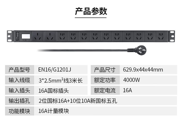 TOWE同为智能数显功率计量PDU机柜插座电源管理器 功率计量PDU插座 2位国标16A+10位10A新国标五孔+16A计量模块 黑色外壳,EN16/G1201J