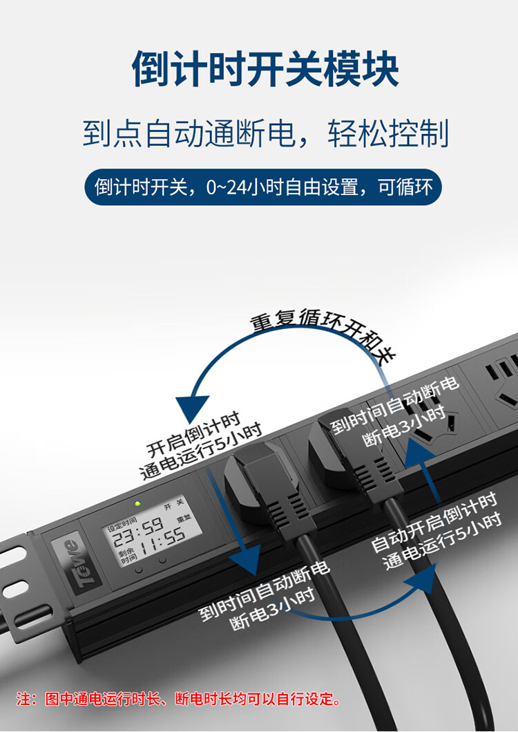 TOWE同为工业定时倒计时PDU机柜插座排插 精确到秒 工业定时PDU插座 3米3*1.5平方带10A国标插头 8位10A新国标五孔,EN10/G814T