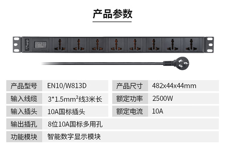 TOWE同为智能数显PDU机柜插座 显示电压、电流 过载分级声光报警 数显过载报警插座 3*1.5平方带10A国标插头 8位10A国标多用孔,EN10/W813D