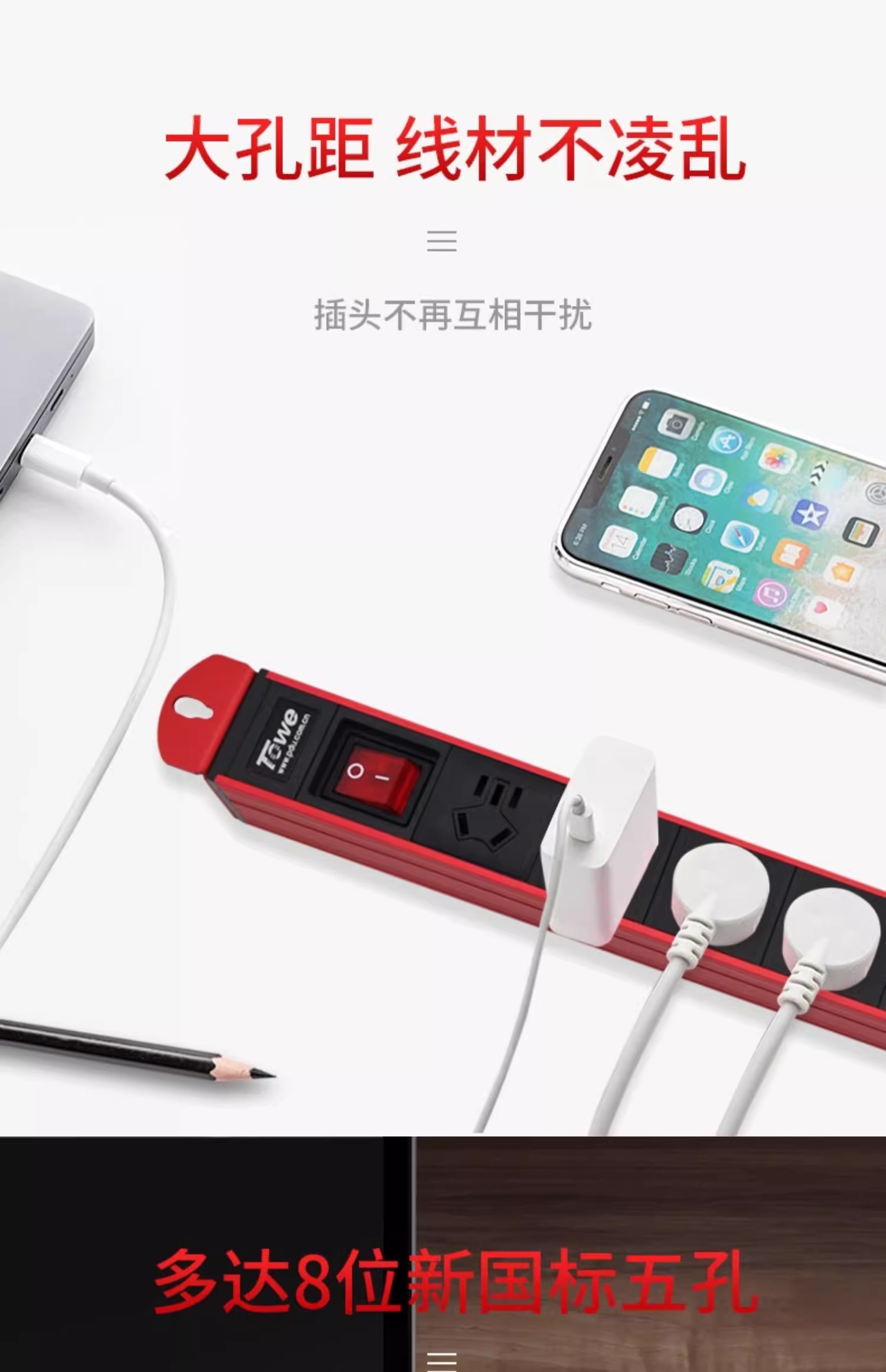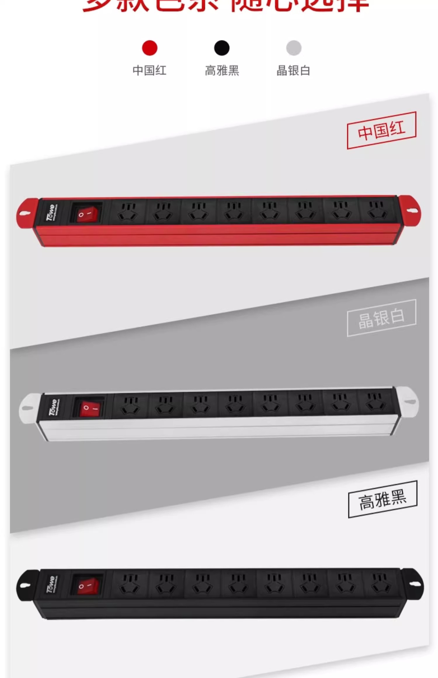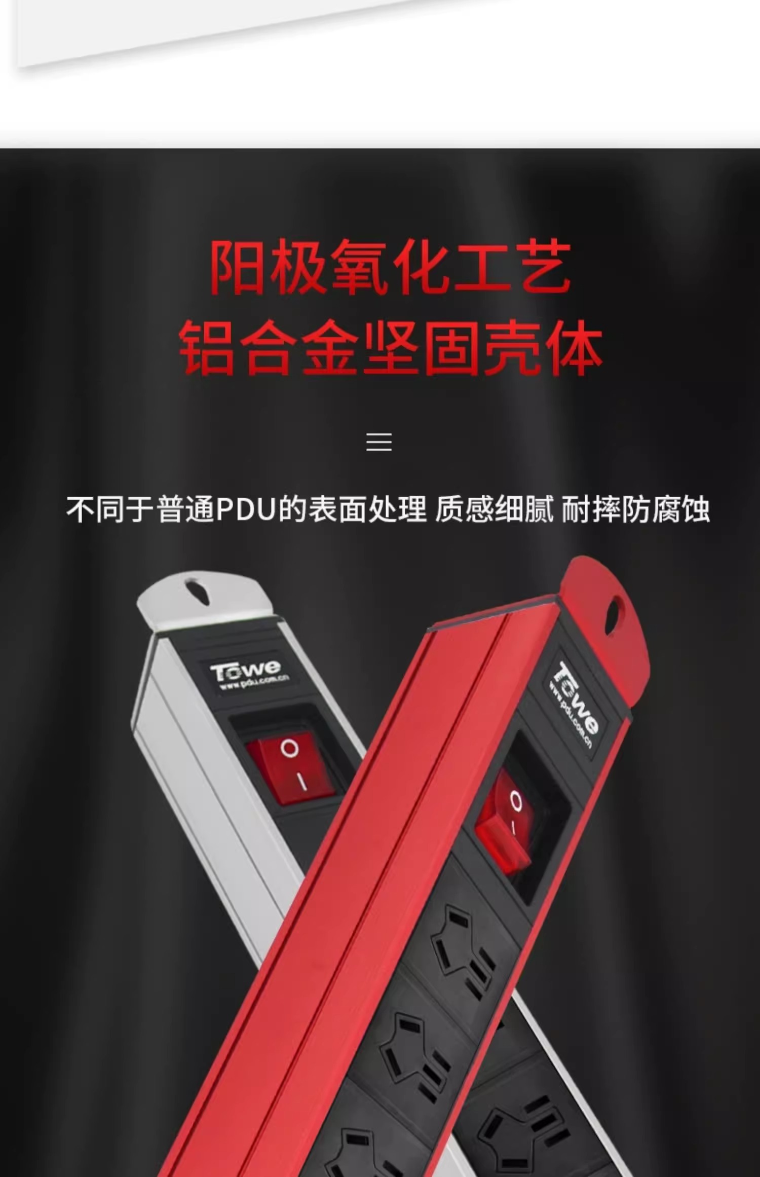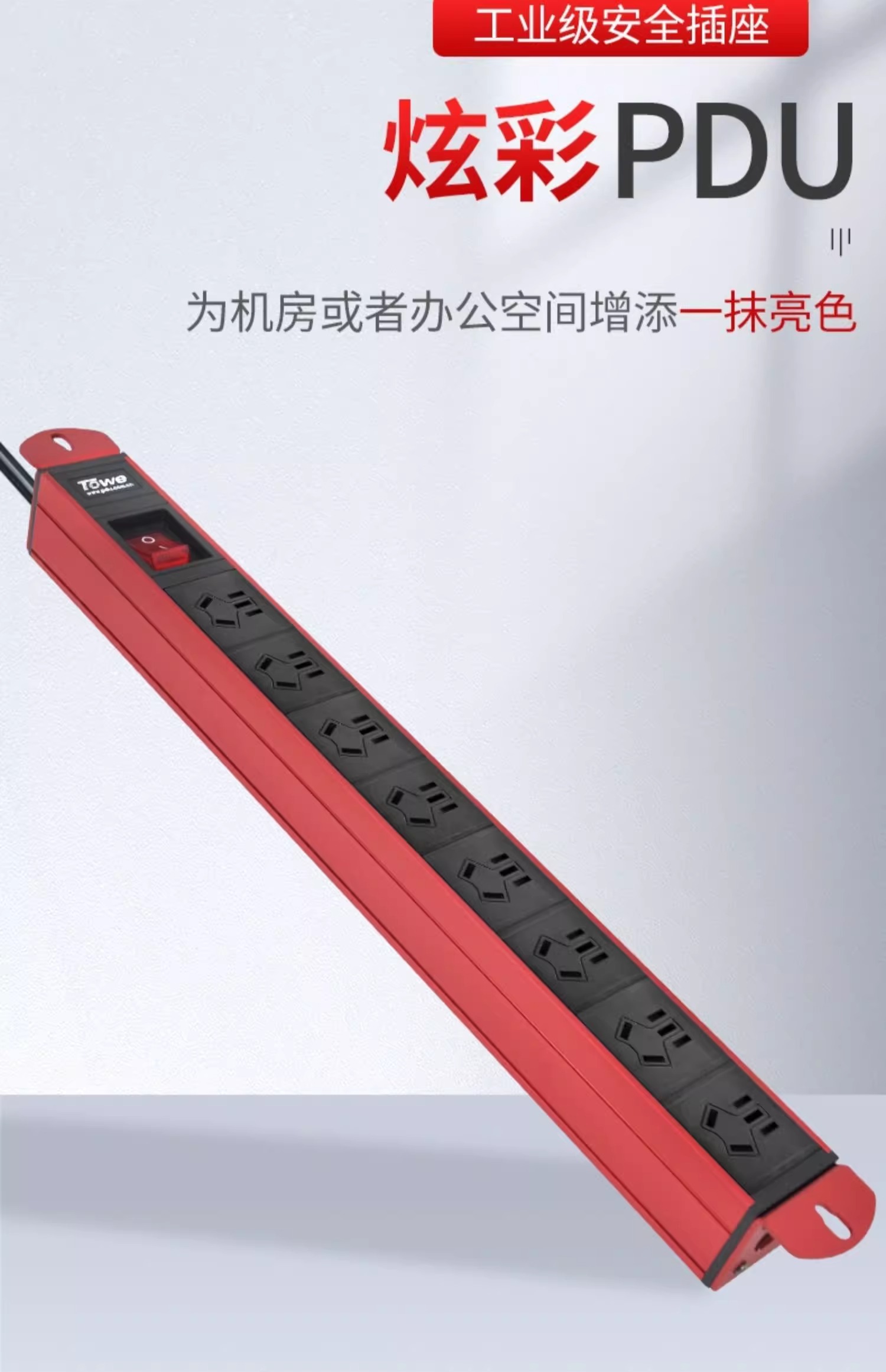 TOWE同为高端pdu机柜插座10A总控防雷防浪涌工业工程插排 炫彩豪华高端系列 总控防雷炫彩PDU插座 7位10A新国标五孔,EN10/C71KS中国红