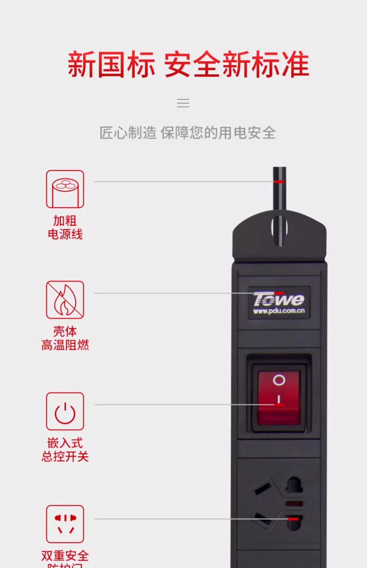 TOWE同为高端pdu机柜插座10A总控双开双断工业工程插排 炫彩豪华高端系列 总控USB炫彩PDU插座 7位10A新国标五孔,EN10/C71KU中国红