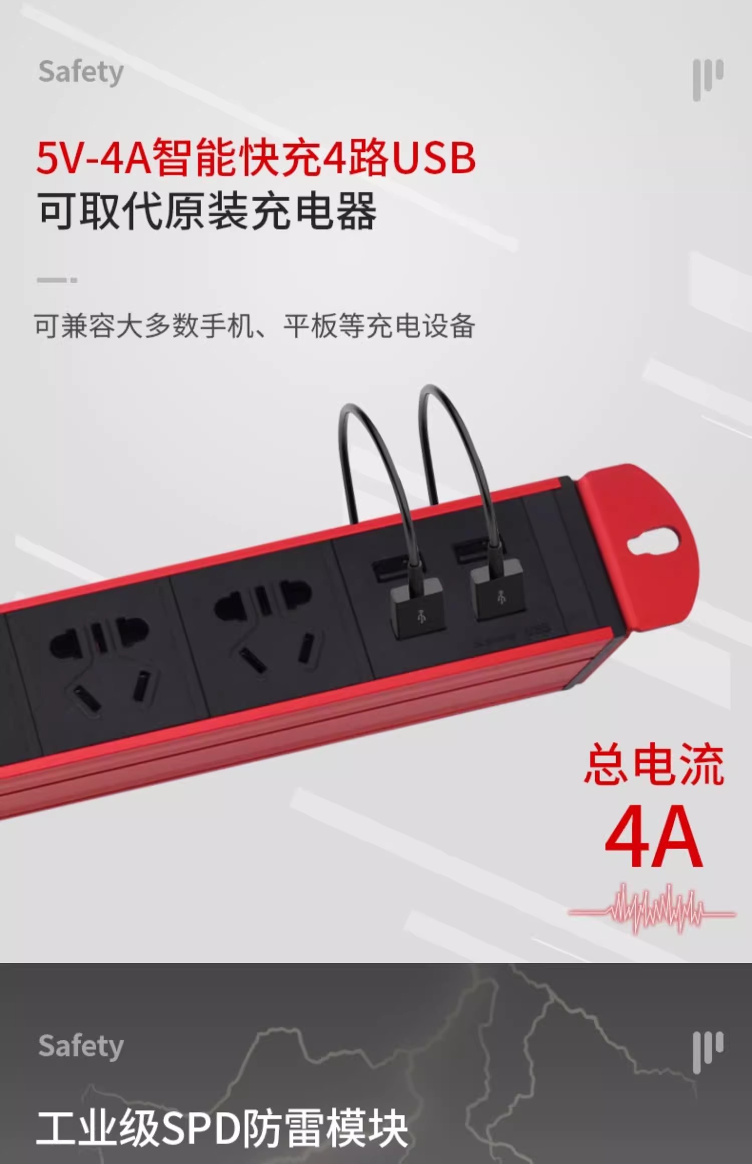 TOWE同为高端pdu机柜插座10A分控单开单控带USB供电工业工程插排 炫彩系列 分控USB炫彩PDU插座 5位10A新国标五孔,EN10/C56KU中国红