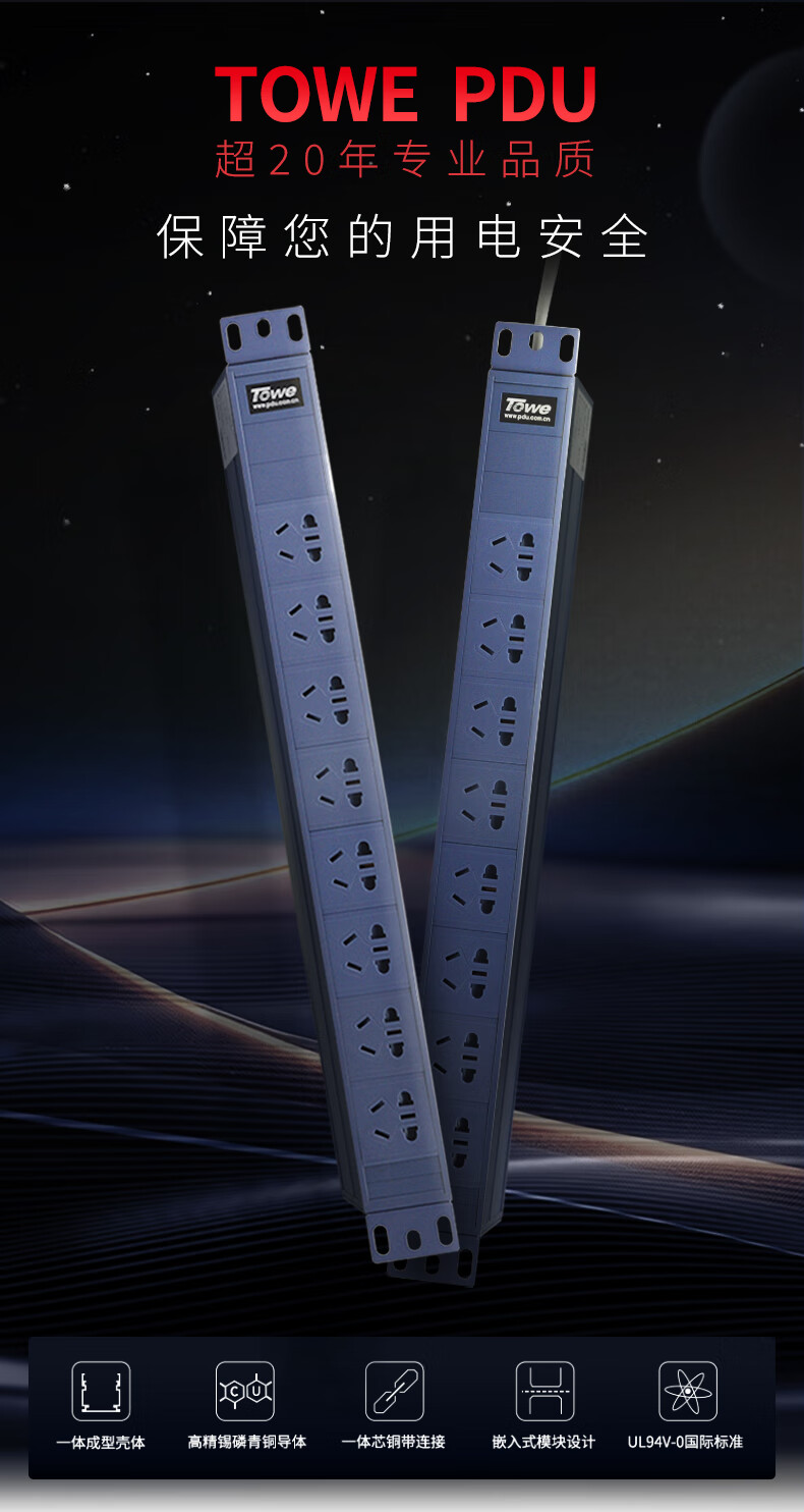 TOWE同为高端pdu机柜插座10A分控单开单控工业工程插排 炫彩豪华高端系列机柜PDU 总控炫彩PDU插座 8位10A新国标五孔,EN10/C81K高雅黑