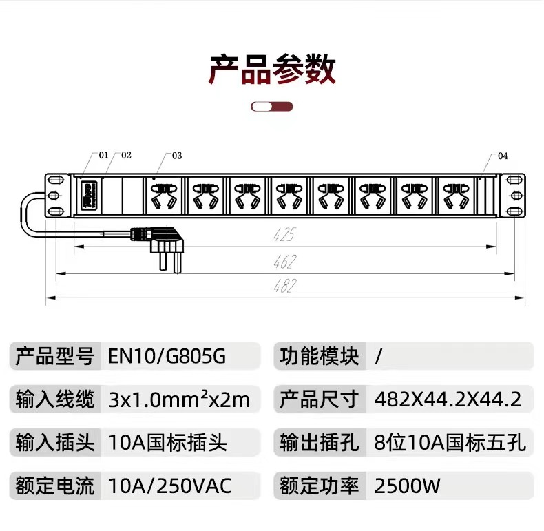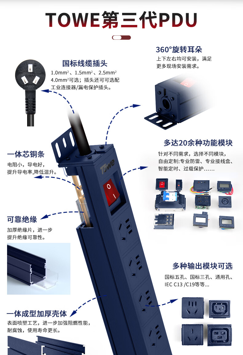 TOWE同为7位8位10A pdu电源机柜插座 10A国标三孔五孔PDU插座电源分配器 带总控开关 灰蓝色超值款PDU插座 8位国标五孔10A,EN16D/G801G