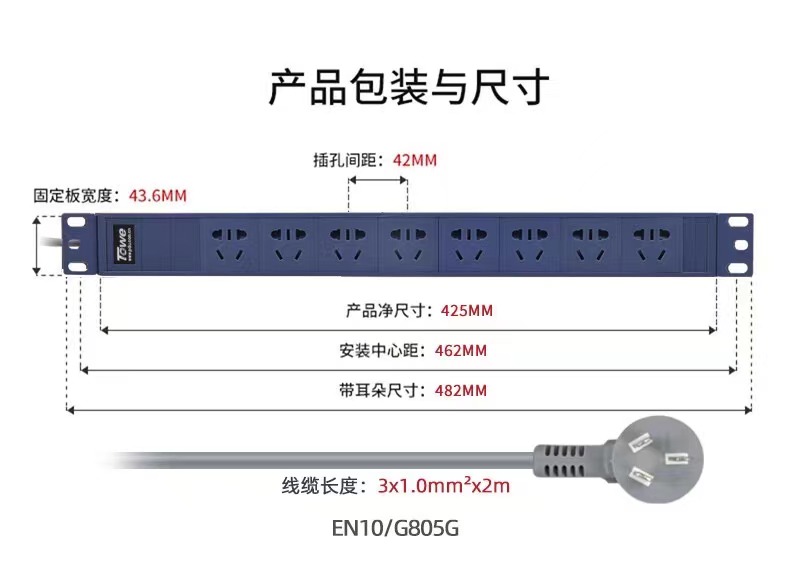 TOWE同为7位8位10A pdu电源机柜插座 10A国标三孔五孔PDU插座电源分配器 带总控开关 灰蓝色超值款PDU插座 8位10A国标五孔,EN10/G805G