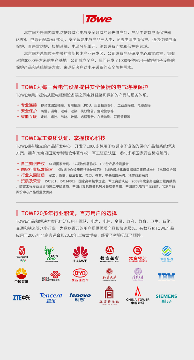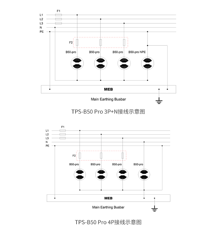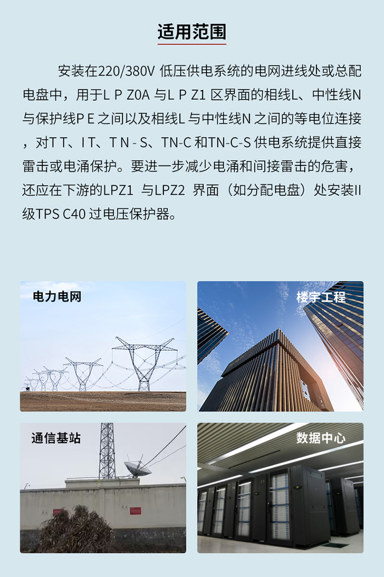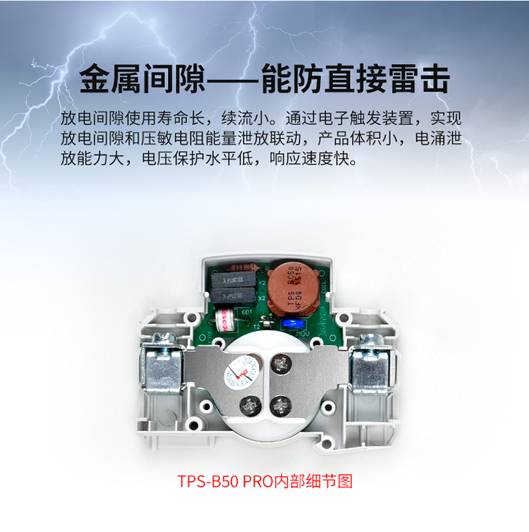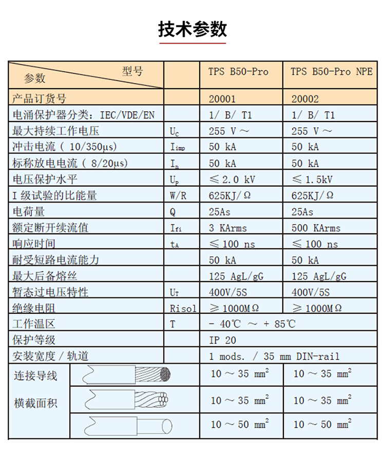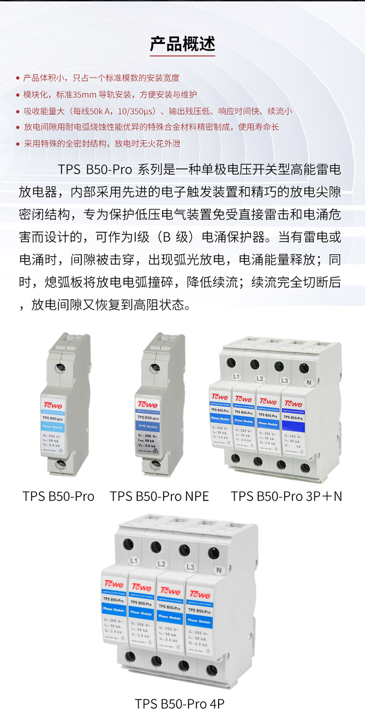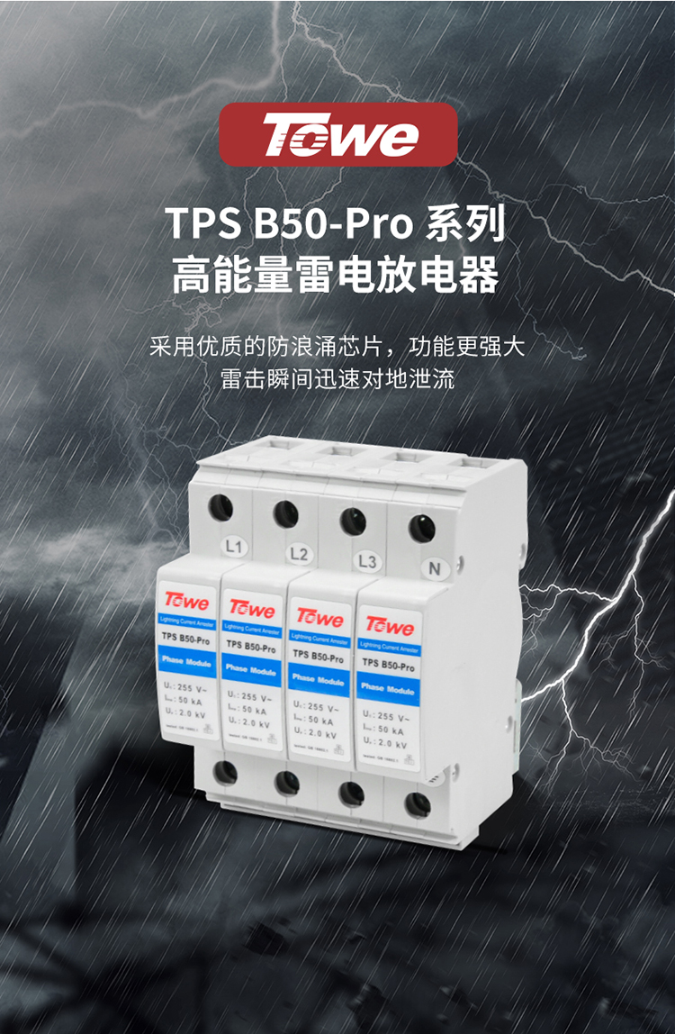 TOWE同为50KA电源电涌保护器B级保护低压电气装置免受直接雷击和电涌灾害安装在低压供电系统的电网进线处或总配电盘中 TPS B50-Pro 4P/3P+N/3P/2P/1P+N/1P/NPE