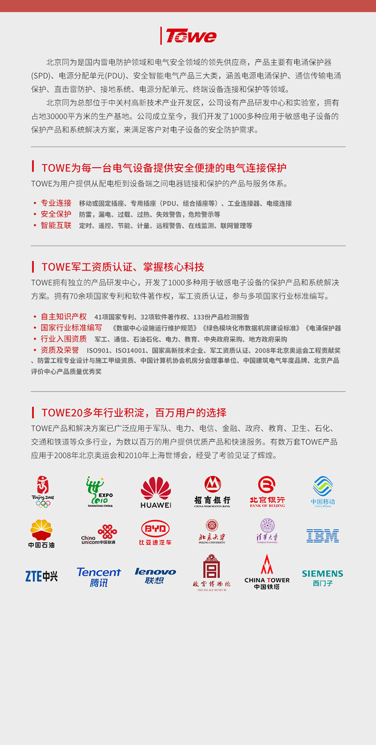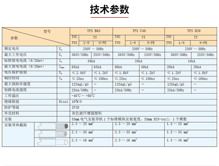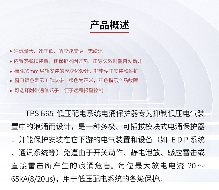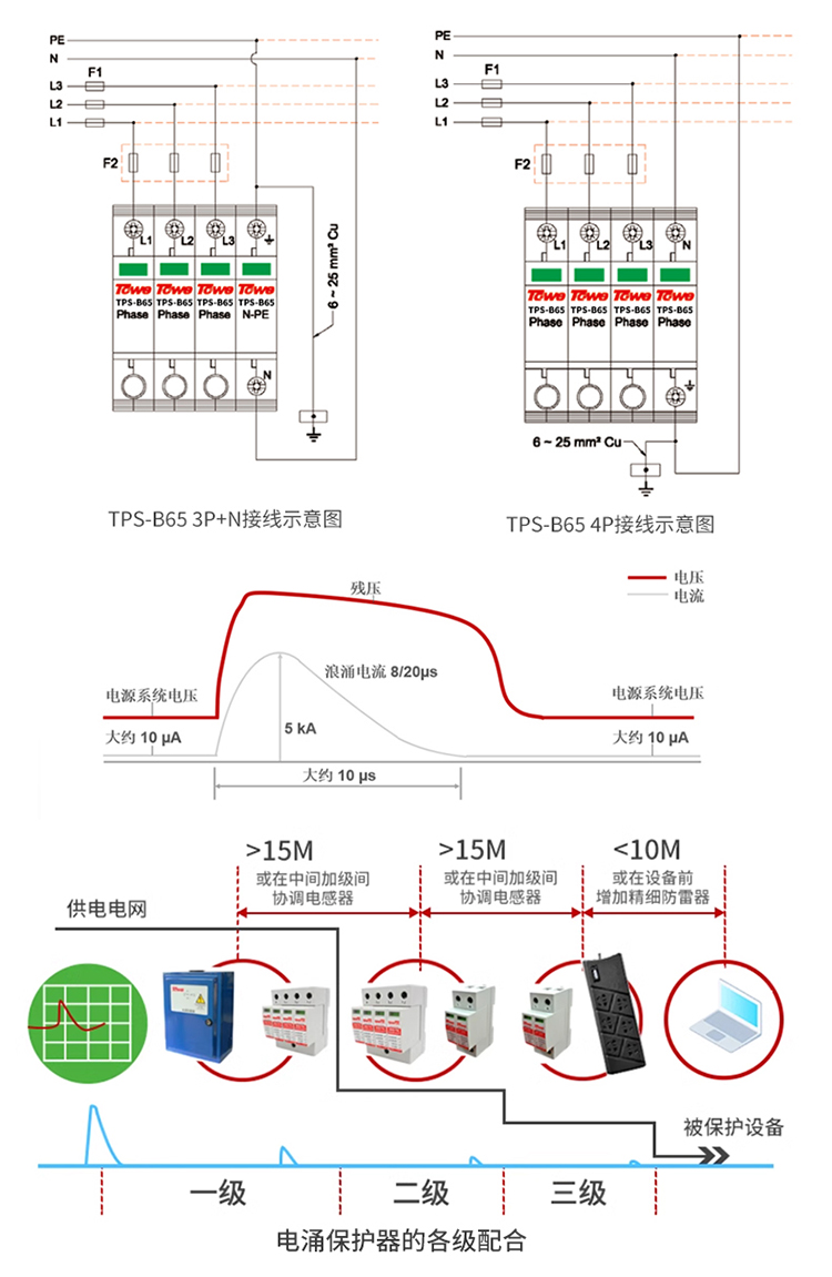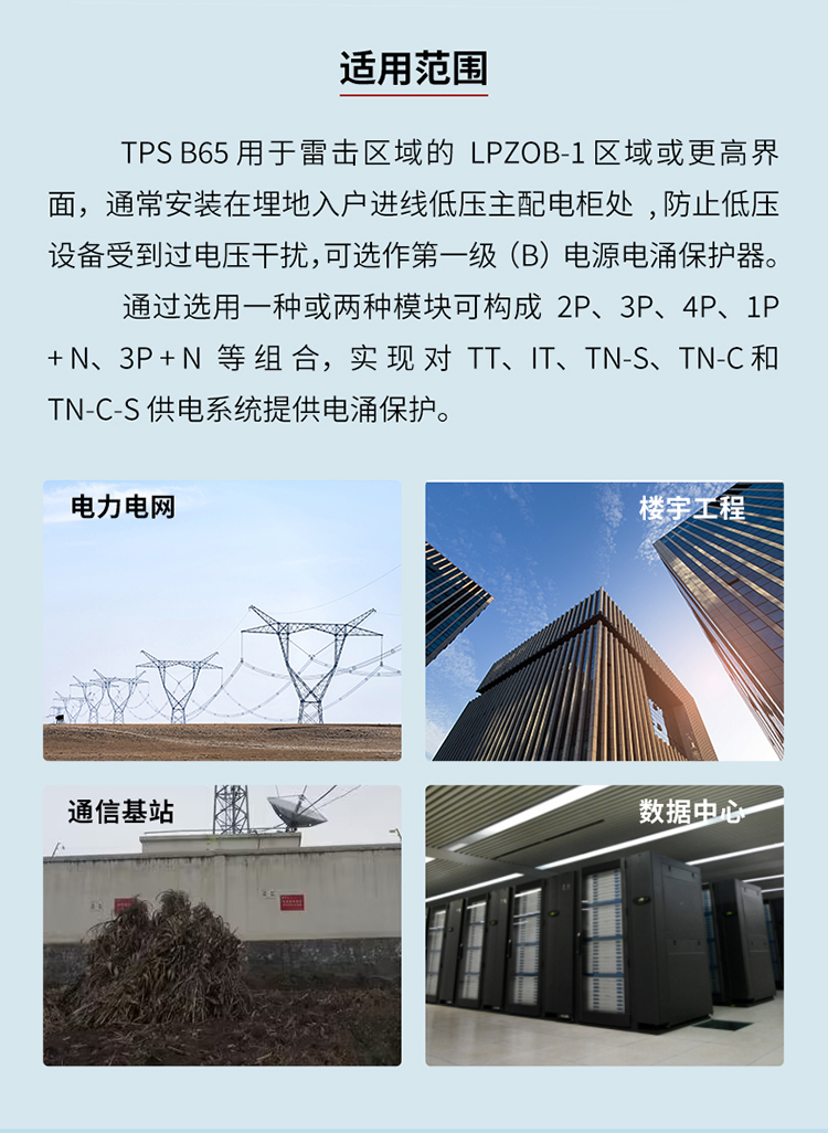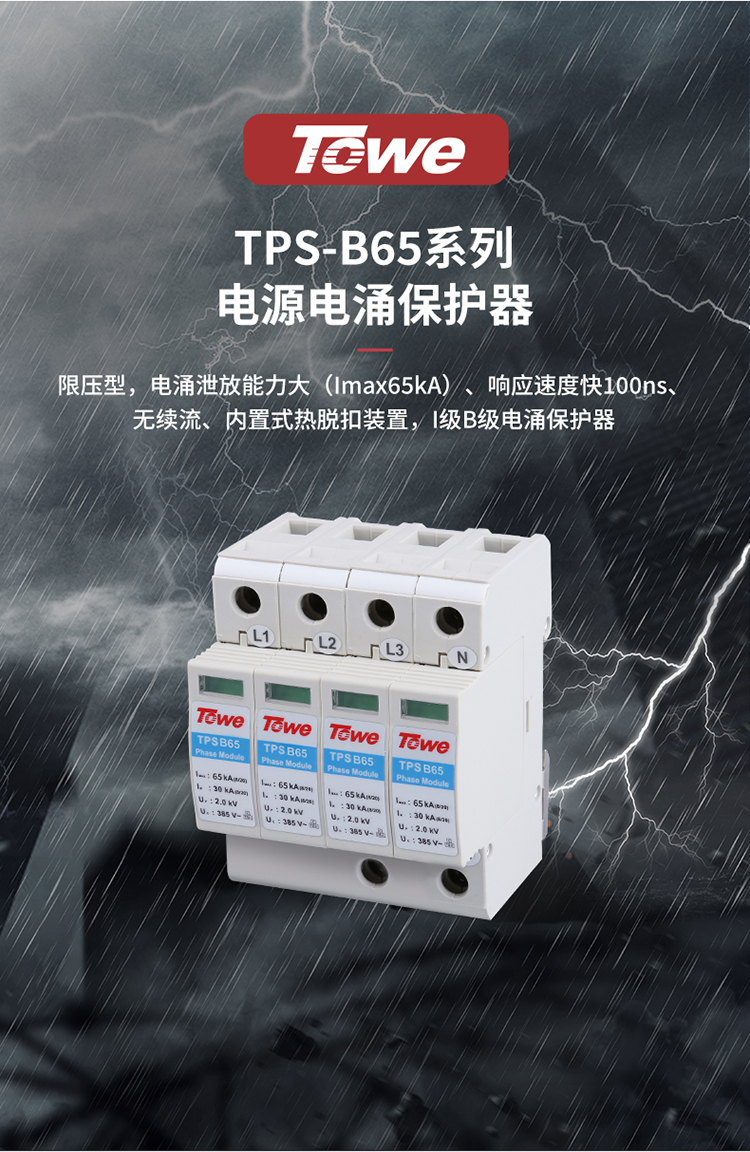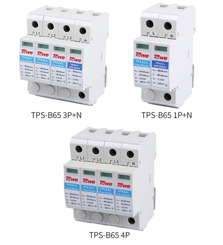 TOWE同为加强型C级65KA压敏型过电压保护器电气装置和设备免遭感应雷击或直接雷击所产生的浪涌危害TPS B65 4P/3P+N/3P/2P/1P+N/1P/NPE